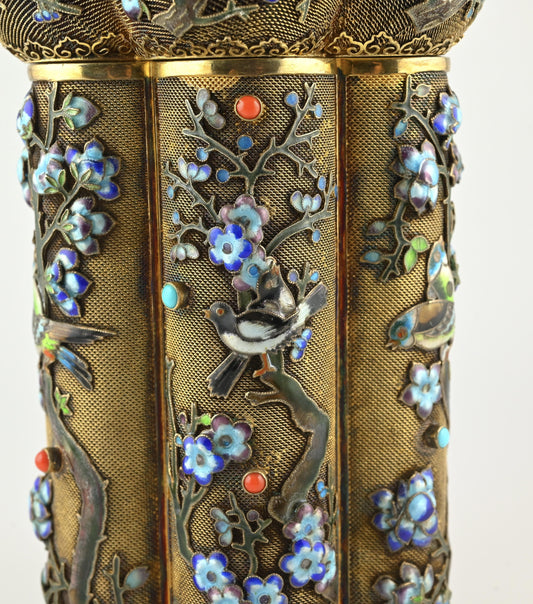 Vintage Chinese Silver Enamel Tea Caddy Box with Turquoise Coral Beads