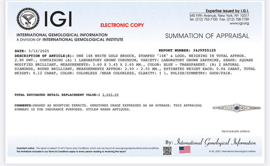 Art Deco Brooch in 14K White Gold with Blue Sapphire & Diamonds IGI Certified