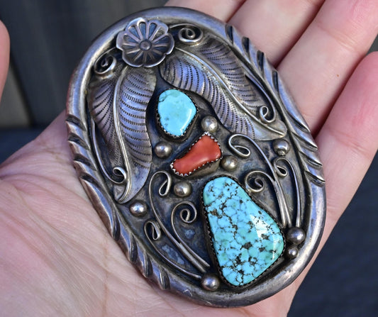 Vintage Navajo Sterling Silver Belt Buckle with Turquoise & Coral – 63.33g