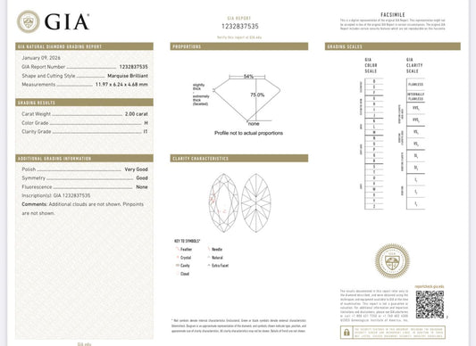 2.00ct Marquise Brilliant Diamond | Natural H Color | Loose Stone GIA Certified