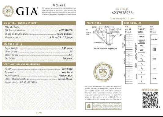 GIA Certified 0.41ct Round Brilliant Diamond | Natural K SI1 Excellent