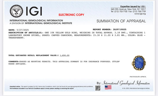 IGI Certified 10K Yellow Gold Carved Spinel Soldier Intaglio Ring Size 5
