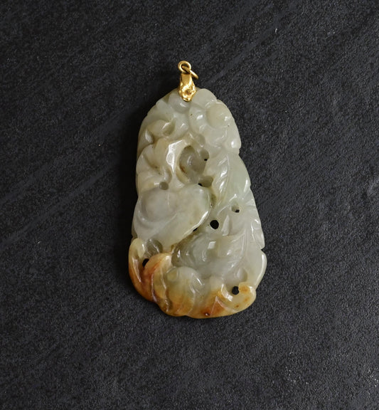 Large Carved Jade Pendant with 14K Gold Bail – 26.16g, 3.5" x 1.5" Floral