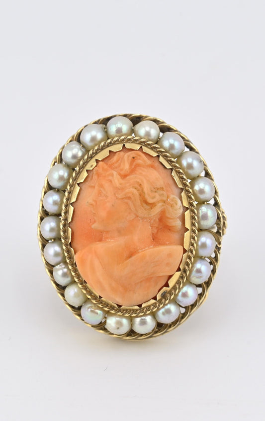 Vintage 14K Yellow Gold Coral Cameo Ring with Seed Pearl Halo – 7.63g, Size 6