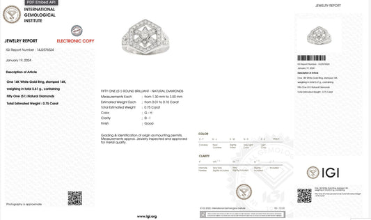 IGI Certified 14K White Gold Geometric Diamond Ring – 0.75 TCW, Size 8