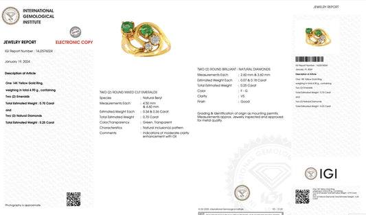 IGI Certified 14K Yellow Gold Ring with 0.70ct Natural Emeralds 0.25ct Diamonds